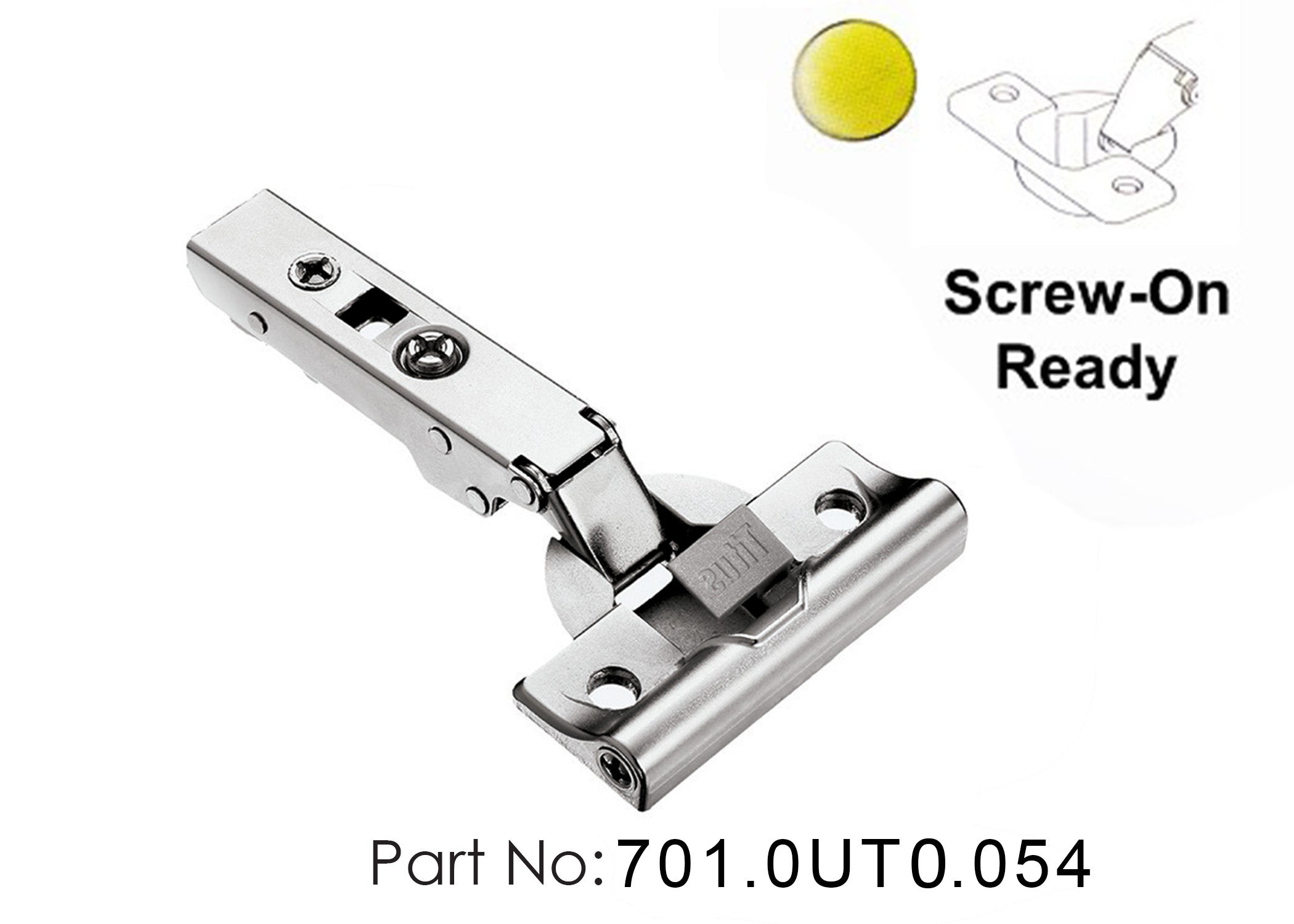 - Clip-on or Slide-on, referring to how the hinge connects to the mounting plate inside the cabinet.
